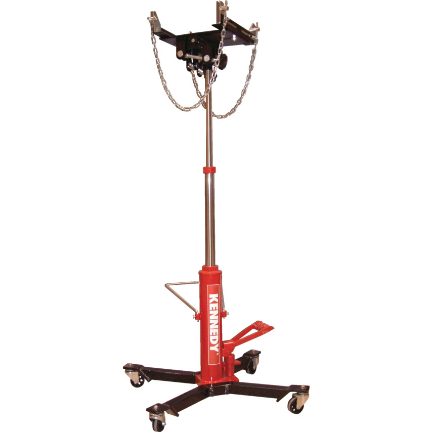 Ideal for car and light commercial transmission removal and installation. Fully adjustable universal rotary saddle with adjustable corner brackets and safety chains. Foot operated pump and release valve leaves both hands free to manoeuvre transmission. Wide base with four 3” dia. swivel-type ball bearing castors providing stability and easy manoeuvring. Two-stage flash chromed rams inhibit rust from entering the hydraulic system. Lifts from 875 to 1800mm. | | Contents TTJ500 | Capacity…1/2 Tonne | Ram Extensions…2 | Minimum Saddle Height…875mm | Maximum Saddle Height…1800mm | Saddle Size…680x810mm | Chain Length…95mm | Saddle Tilt Forward…24” | Saddle Tilt Back…19” | Saddle Tilt Side…+/- 20” | Saddle Return Weight…15.8kg (35lbs) | Base…695 x 805mm | Weight…68.5kg