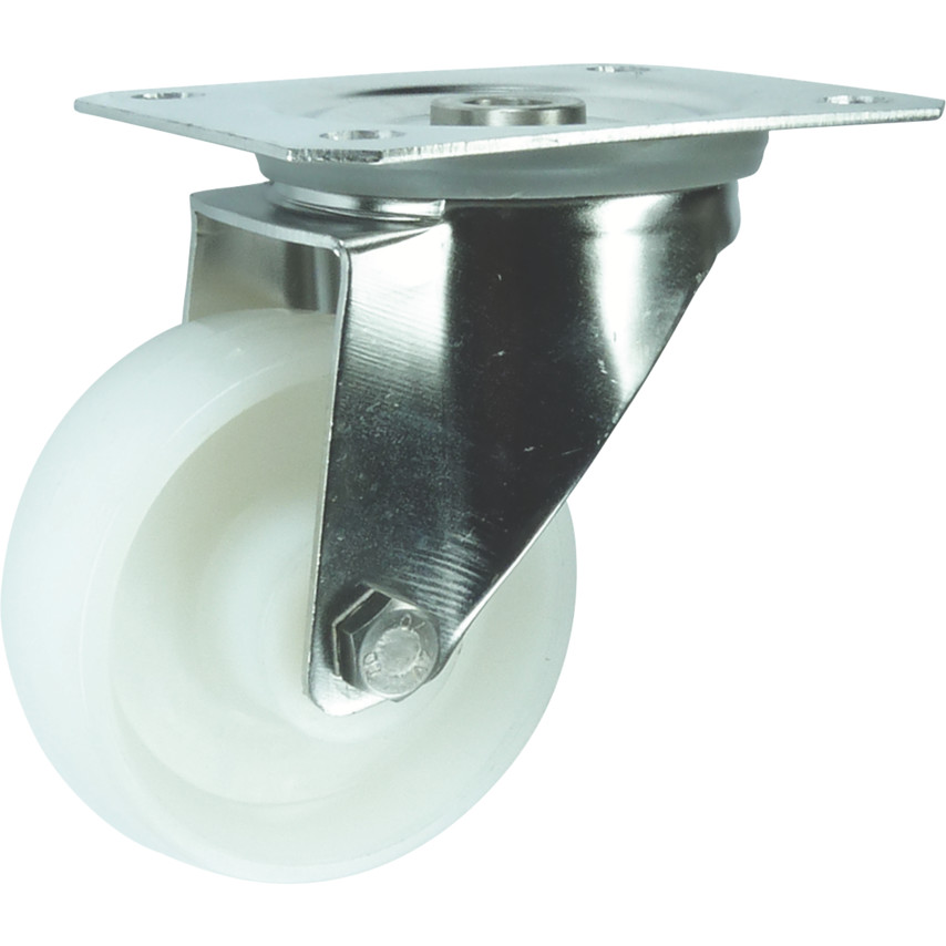 Stainless steel castors are used in food processing and catering, clean room environments, medical and hospital sectors, laboratories, and schools. Colour: White Wheel material: Nylon Tyre material: Nylon Roller bearing Ideal for machinery, trolleys and any industrial equipment Suitable for washdown Anti corrosive